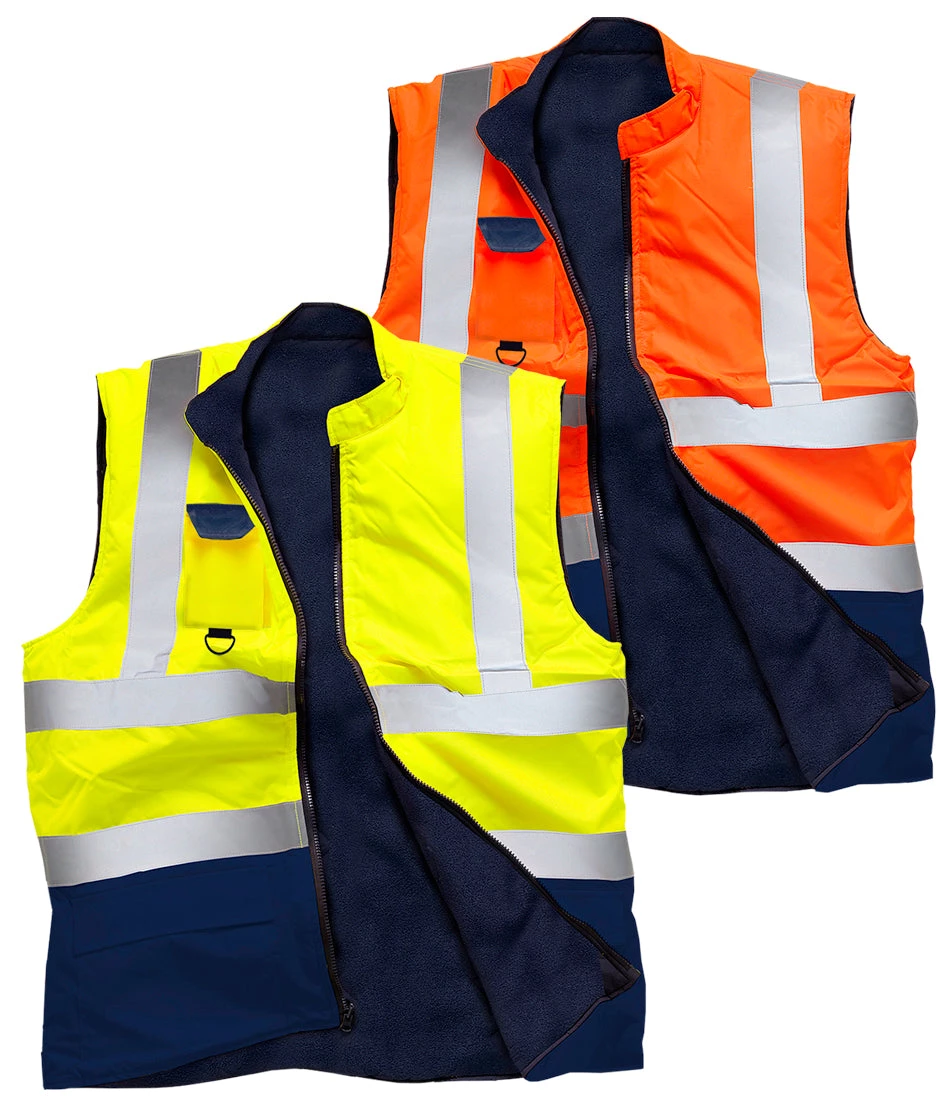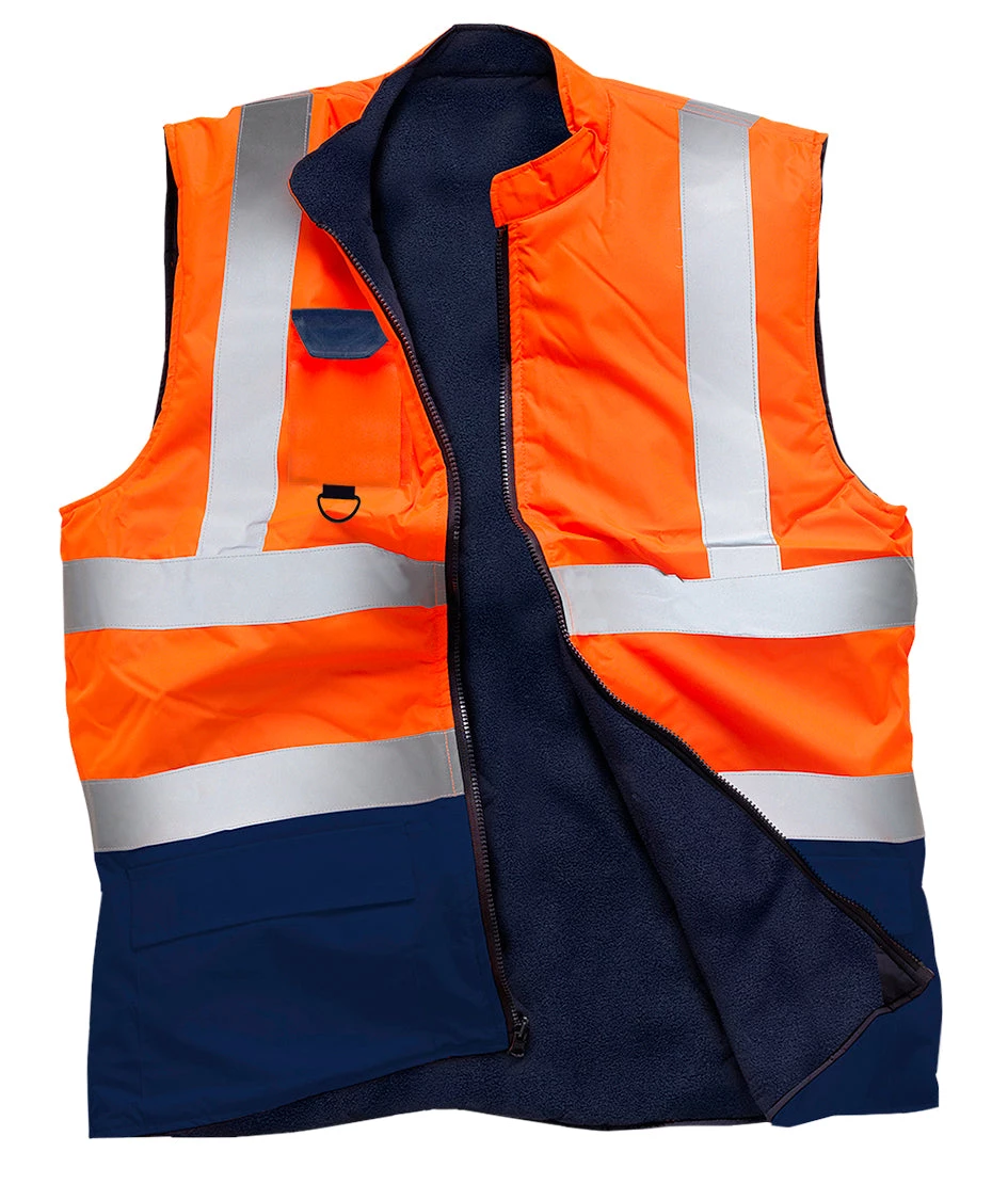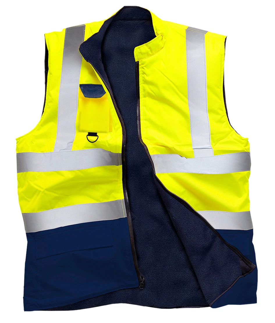 High-visibility reversible gilet with fleece lining. Our soft lining in 100% Polyester fleece is very comfortable and keeps you warm, even in the coldest weather. Perfect for the winter months. This bodywarmer features a mobile pocket, D-Ring, and a full-length zip up to the collar.