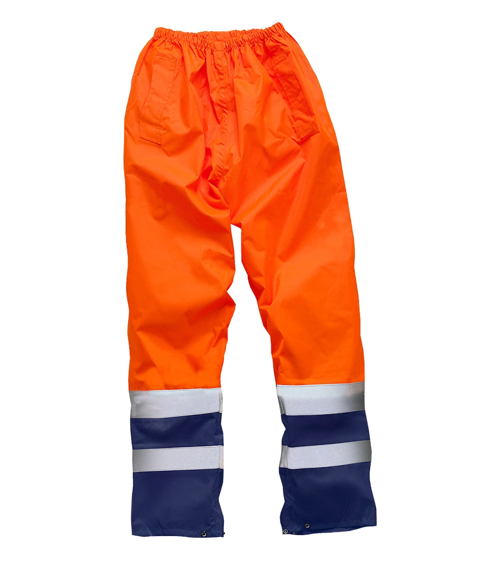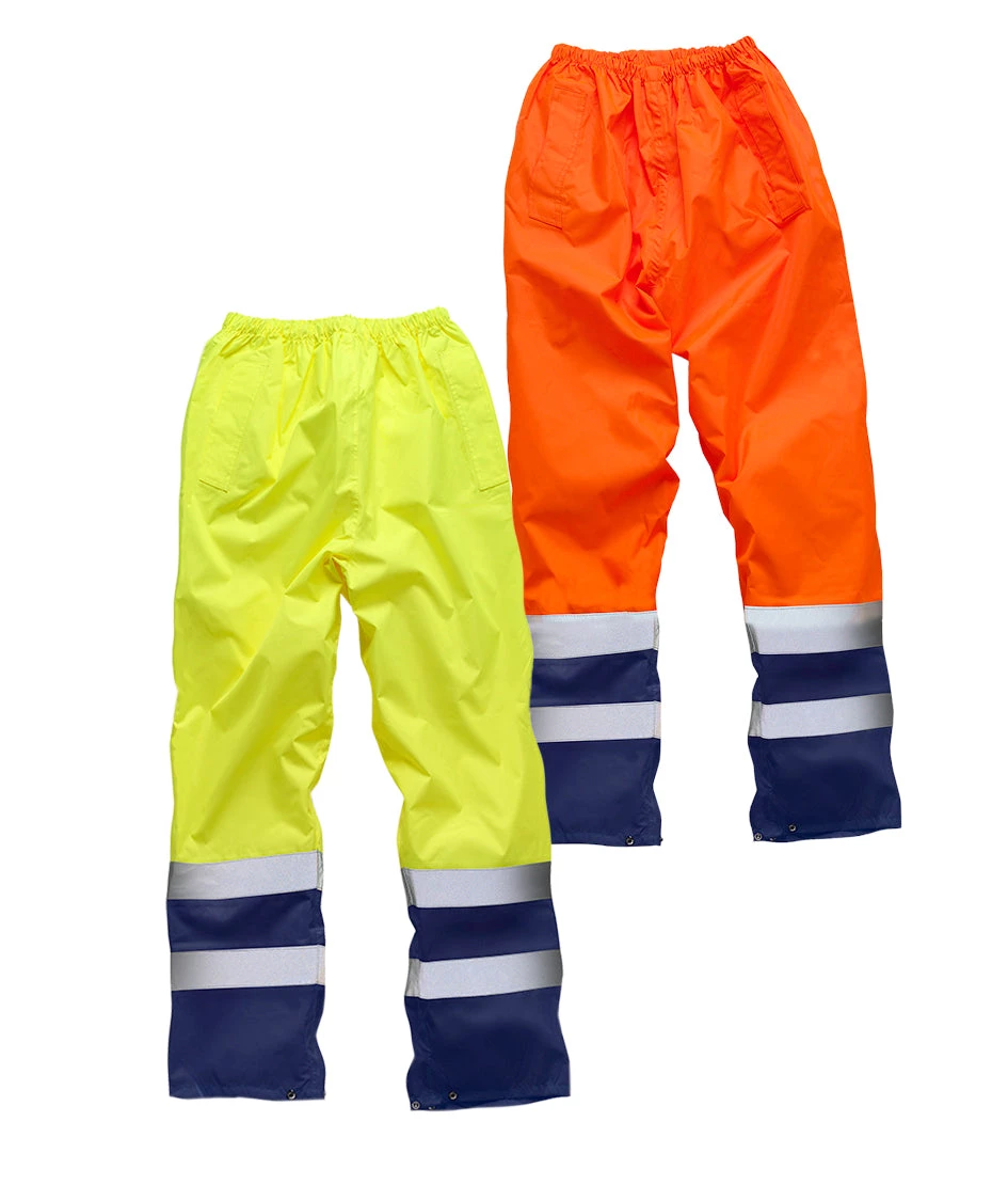 Lightweight two-tone hi-vis over trousers. These trousers provide light wind and water protection with fully taped seams. Comfortable fit with an elasticated waist and adjustable boot access. Certified to EN ISO 20471: 2013 Class 1.