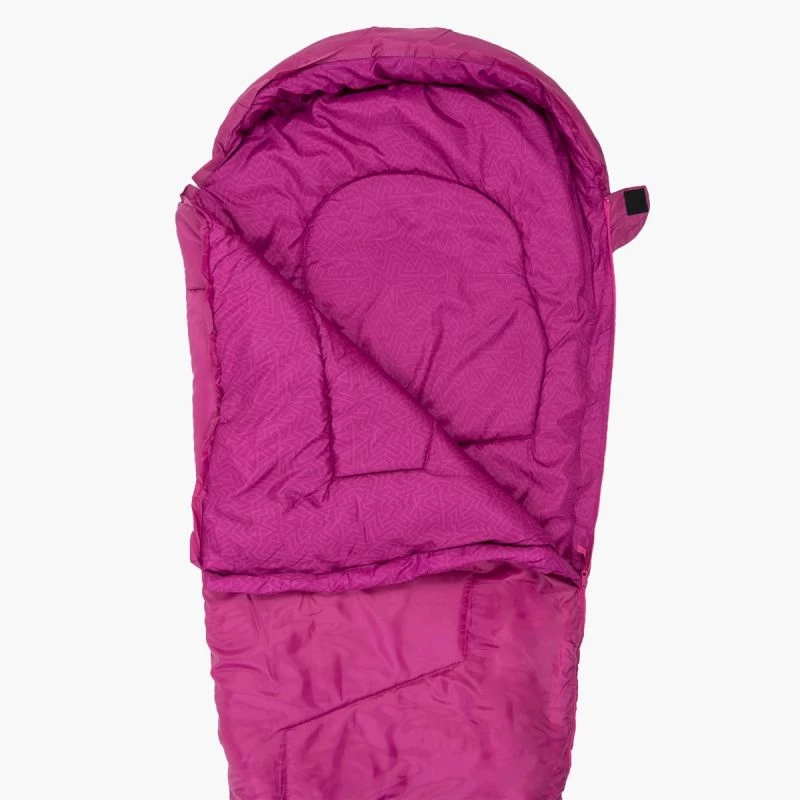 The Sleepline Jnr is a classic mummy style sleeping bag with an Aztec print soft lining fabric and a full length 2 way zip and baffle