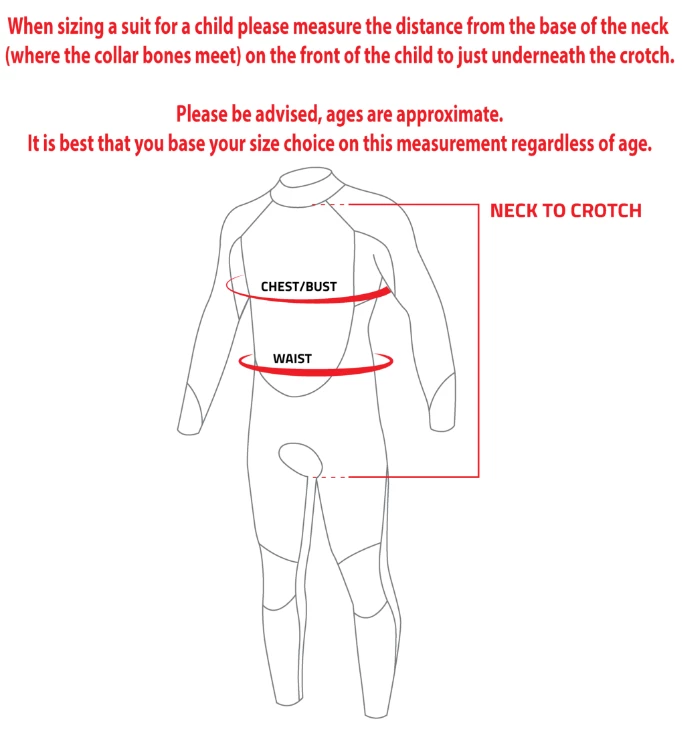 PLEASE USE THE SIZE GUIDE BELOW – AGES ARE APPROXIMATE – USE THE NECK TO CROTCH SIZING FOR THE BEST FIT